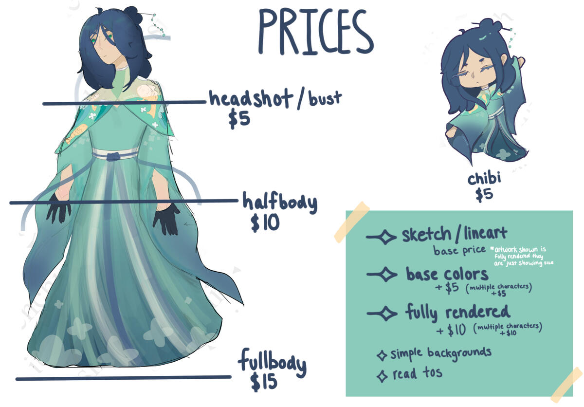 fully rendered: +$10multiple characters: add coloring price for each additional characteri dont do backgrounds unless its simpleex: basic colored halfbody $18 USD